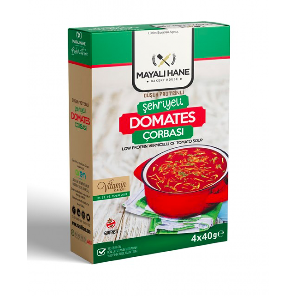 - Hazırlanışı için 1 paket Mayalı Hane Düşük Proteinli Şehriyeli Domates Çorbası’nı (40 g), 2 su bardağı (500 ml) soğuk suya ilave ediniz. Ardından kaynayana kadar karıştırınız. Kaynadıktan sonra kısık ateşte 10 dakika daha pişirip servis ediniz